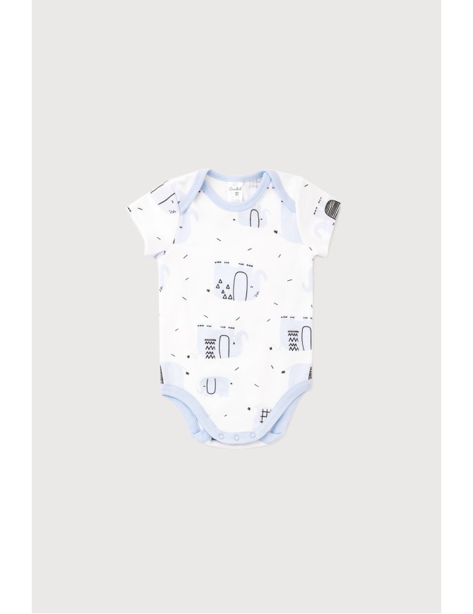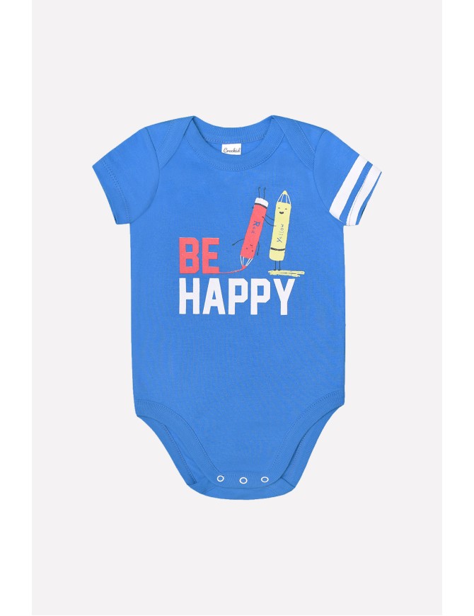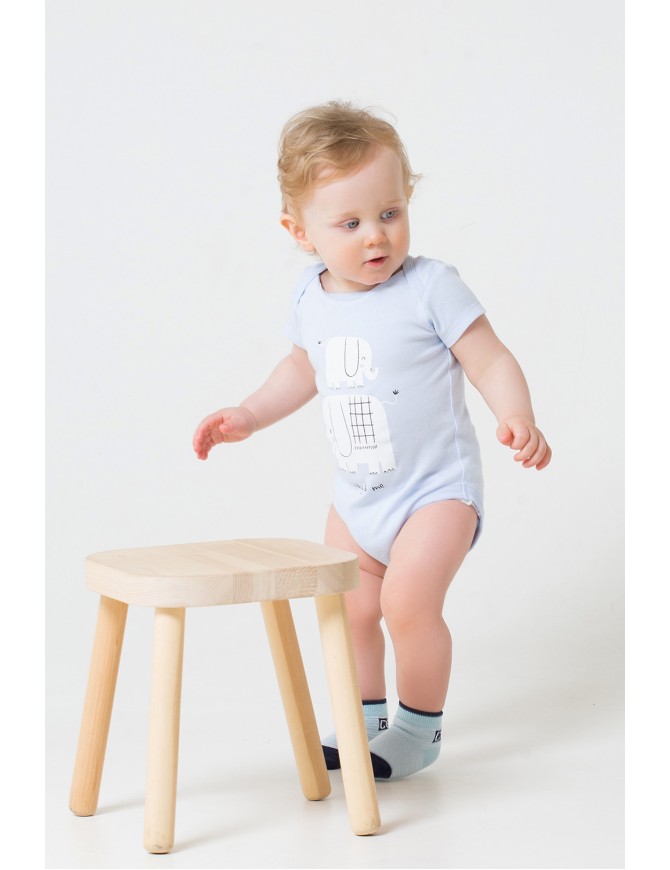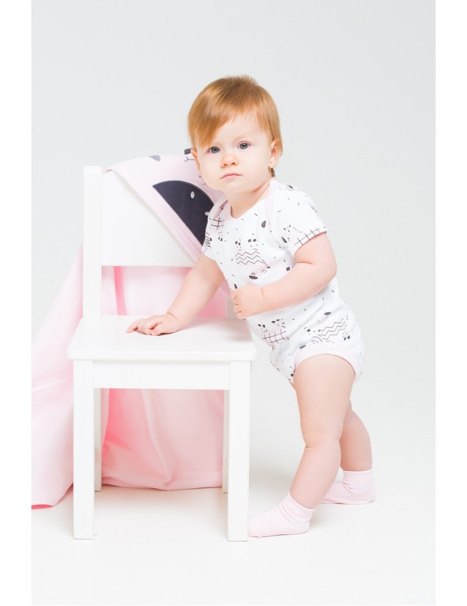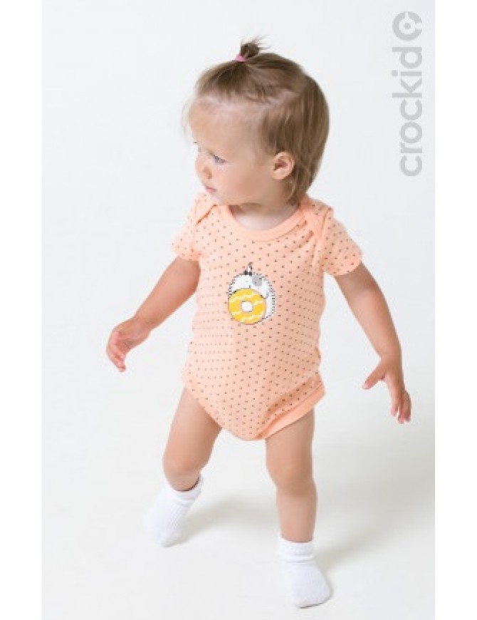 Боди из однотонного хлопка. Короткие рукава. Принт на полочке и рукаве. Застёжка на кнопки по низу изделия