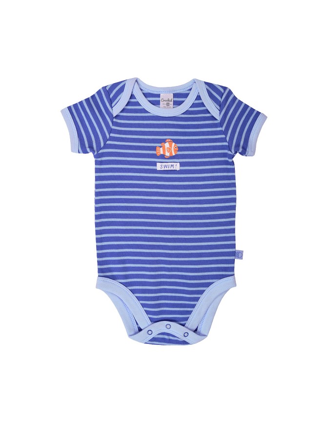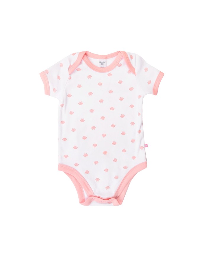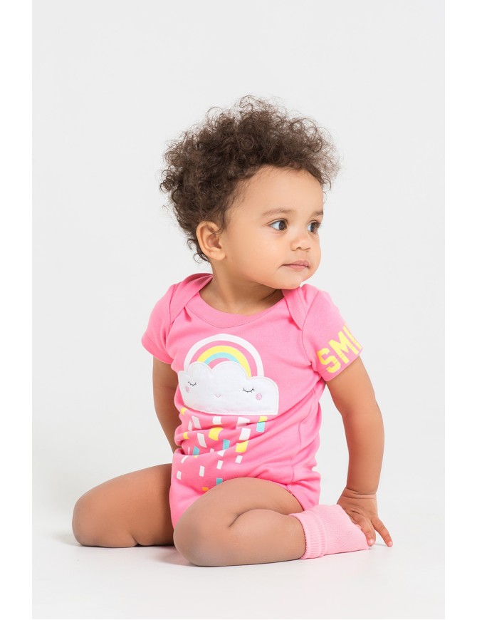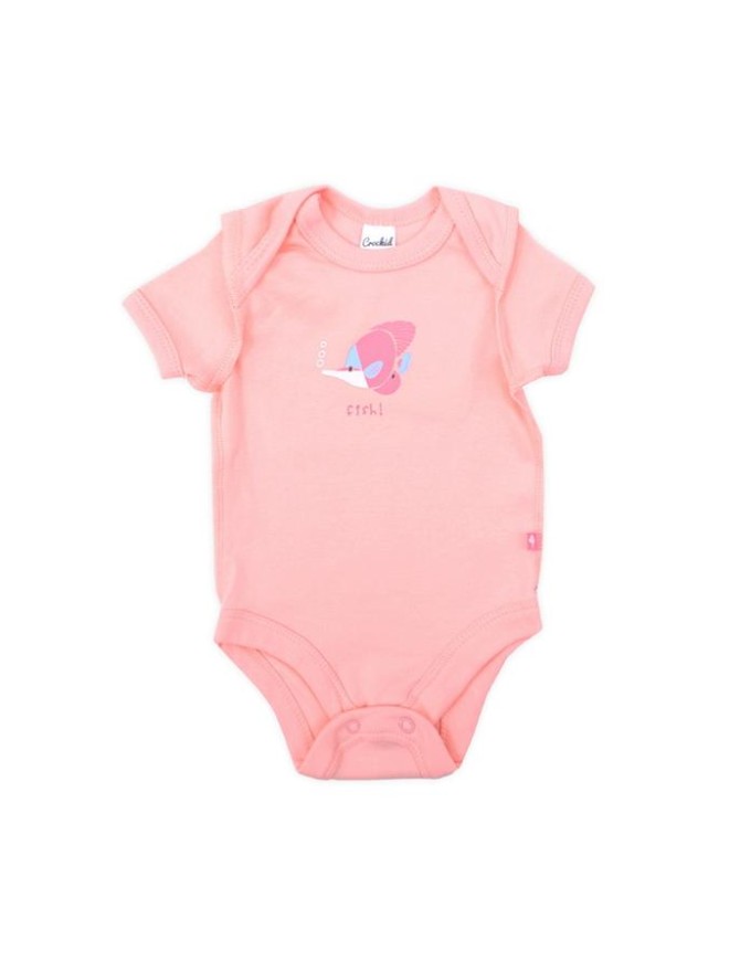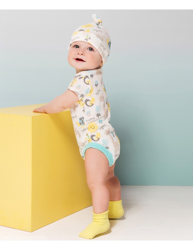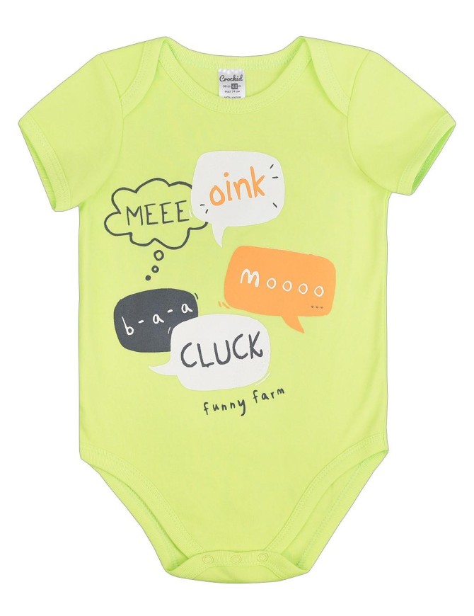 Боди из однотонного хлопка. Короткие рукава. Принт на полочке и рукаве. Застёжка на кнопки по низу изделия