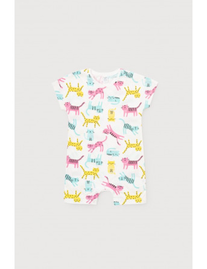 Песочник для девочки из мягкого трикотажа с короткими рукавами. Украшен набивным принтом. Застёгивается на кнопки на плече и пошаговую застёжку на кнопки в паху.