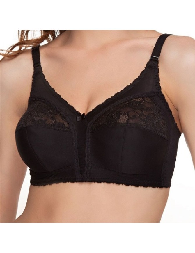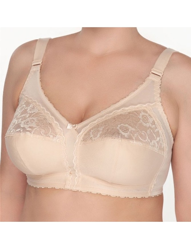 Бюстгальтер из неэластичного кружевного ламинированного и трикотажного полотен. Без каркасов. Нижние детали чашек из неэластичного трикотажного полотна, ламинированного хлопком.