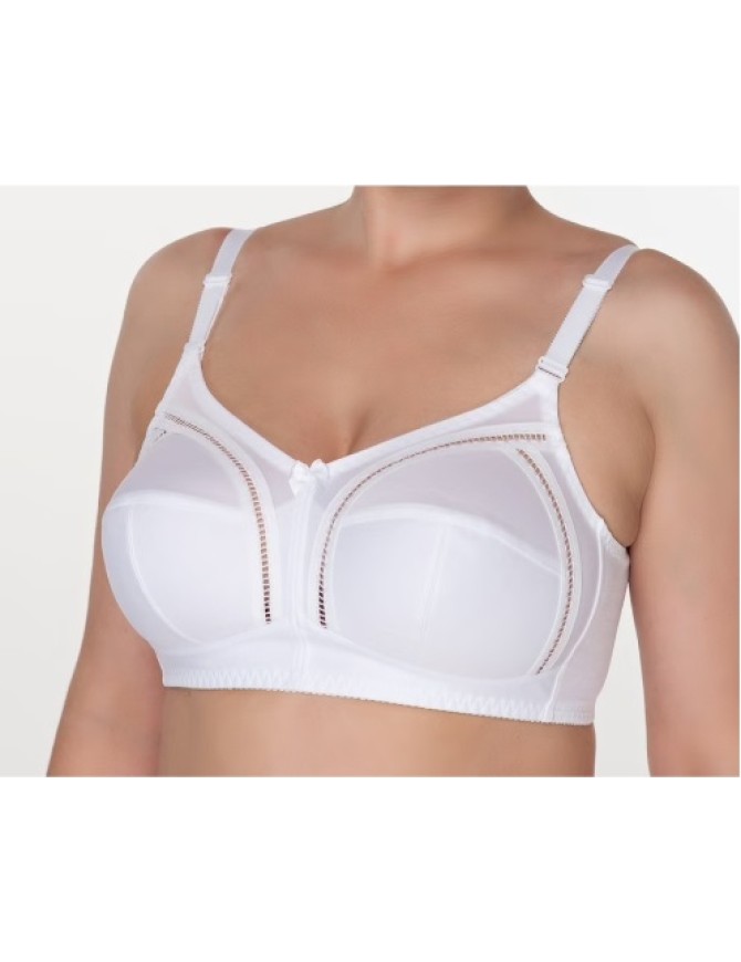 Бюстгалтер из неэластичного трикотажного полотна, неэластичного трикотажного полотна ламинированного хлопком и эластичного трикотажного полотна, Без каркасов. Нижние детали чашек из неэластичного трикотажного полотна ламинированного хлопком. Отделка - тесьма с эффектом "мережки" и бантик на центральной детали бюстгальтера.
