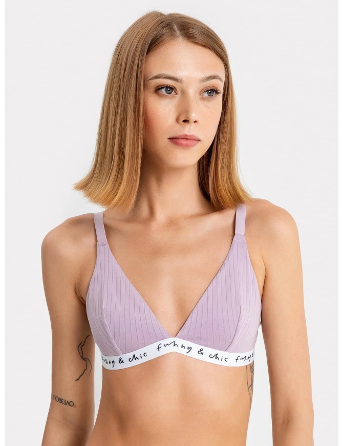 Актуальный женский бюстгальтер с мягкими треугольными чашками без косточек. Выполнен из стильного полотна в рубчик. Нижний срез бюстгальтера окантован эластичной жаккардовой тесьмой. Рекомендуем для стильных образов!