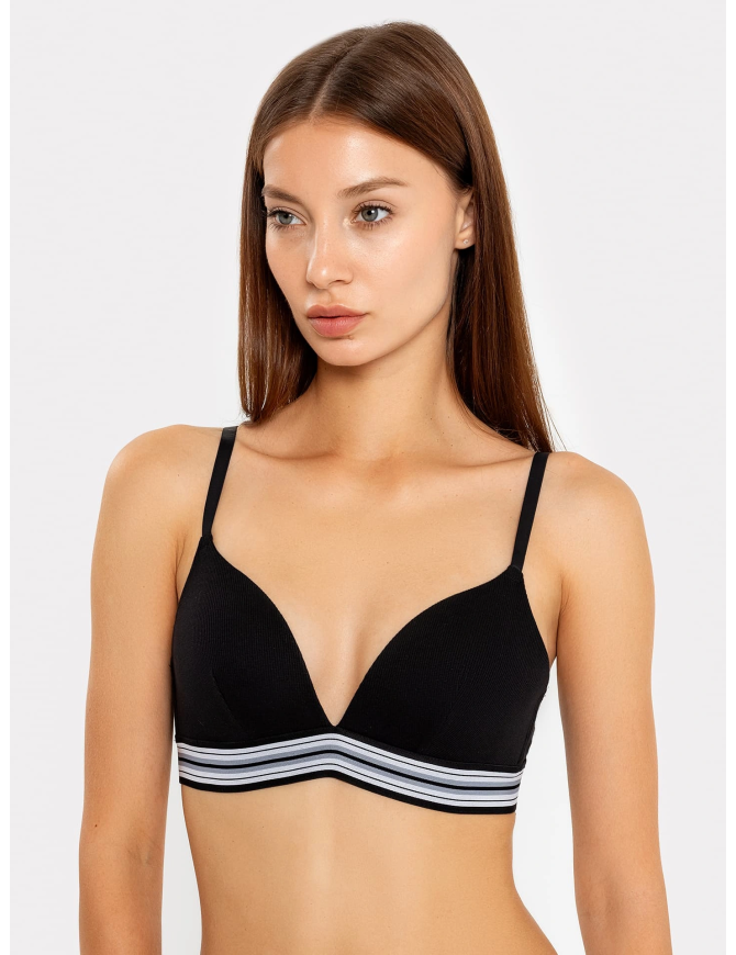 Основной материал: полотно трикотажное рибана. Бюстгальтер тишот с жесткими формованными чашками, без каркасов. Чашки и стан из рибаны. По верхнему срезу стана эластичная тесьма. В бок чашки вставлены пластины.