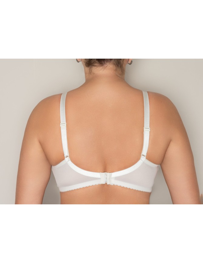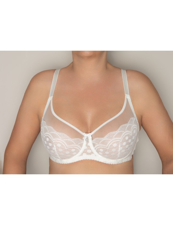 Бюстгальтер мягкая чашка- сочетает в себе легкость и комфорт. Несмотря на кажущуюся прозразчность, обеспечивает стабильную поддержку для больших размеров. Надежный пояс изделия усилен боковыми пластинами. Украшение - бантик с жемчужинкой.