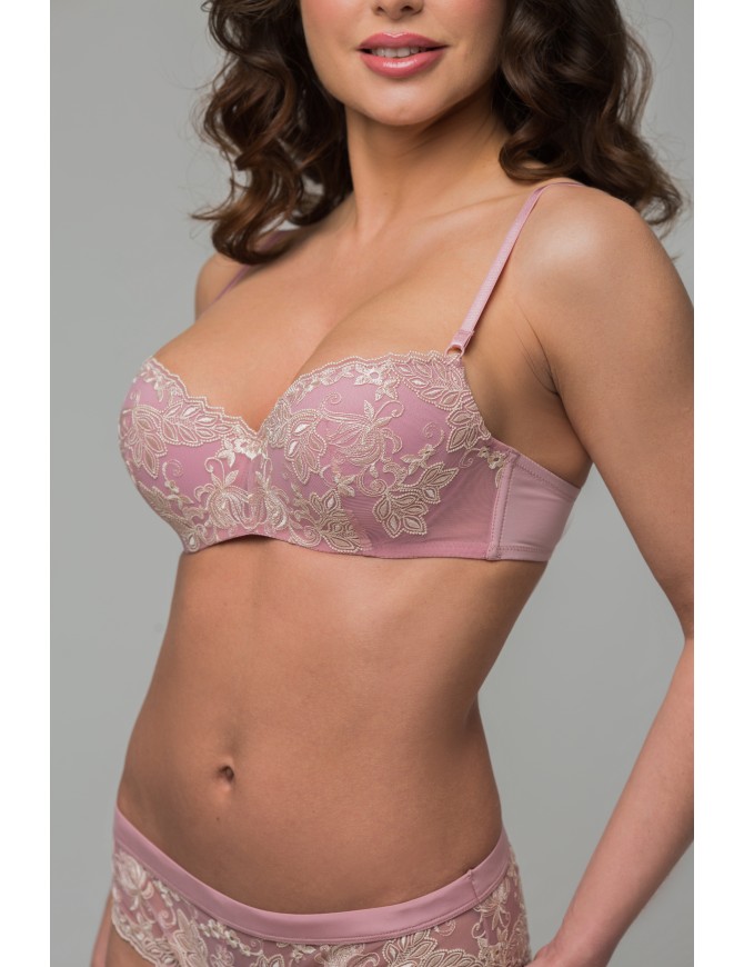Модель выполнена из изящной объёмной вышивки с элементами в стиле растительного барокко нежного молочного цвета на мягкой сетке пыльно-розового оттенка и мягкого блестящего полотна. Неклассический крой передней детали, скрывающий каркасы, создаёт эффект присборенности и приподнятости груди. Модель, благодаря необычному дизайну вышивки и нежного оттенка эластичного полотна, не оставит равнодушной ни одну современную представительницу прекрасного пола.