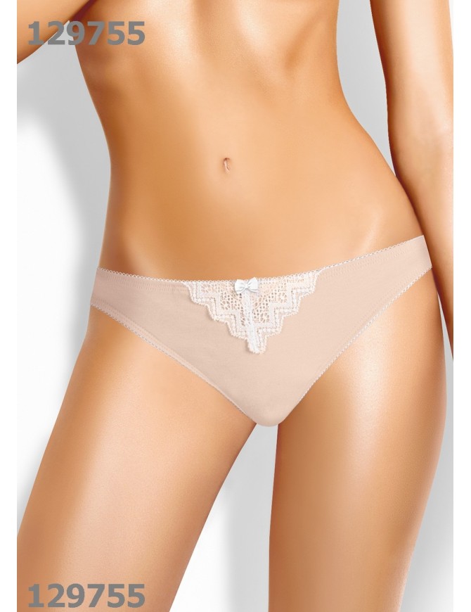 Трусы стринги комфортной посадки из хлопкового полотна с добавлением эластана. По талии и ножке окантовка ажурной резинкой с фестоном. Спереди симметричные боковые вставки из кружева. Завершает дизайн небольшой бант на детали переда.