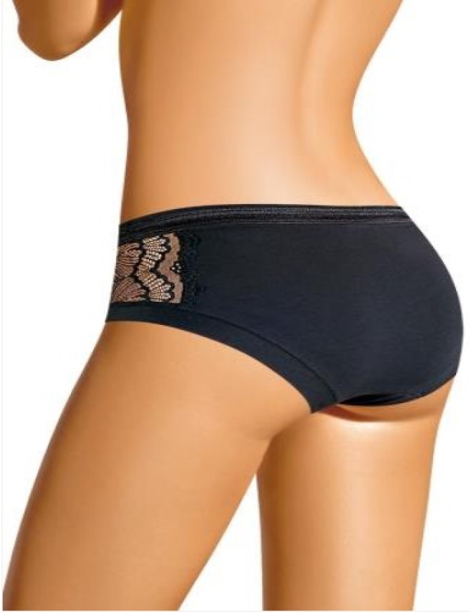 Бикини комфортной посадки из хлопкового полотна с добавлением эластана. Модель с отрезным бочком из кружева. По талии обработка сеткой и ажурной резинкой, по ножке со стороны переда-полуокантовка, со спинки - обработка сеткой, с заходом на деталь переда.
