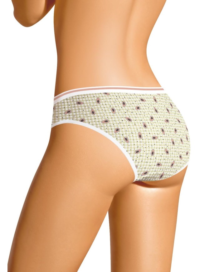 Трусы бикини комфортной посадки из хлопкового полотна с добавлением эластана. По талии резинка с принтом 1,5 см, по ножке окантовка резинкой.