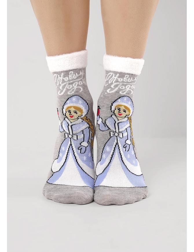 Женские носки с рисунком снегурочки, надписью веселого нового года, борт выполнен из пряжи травка