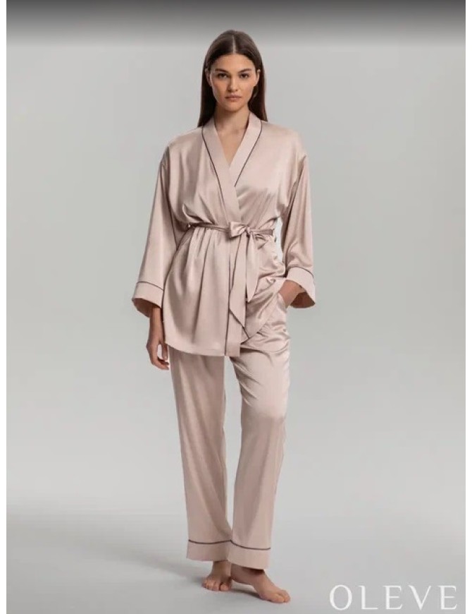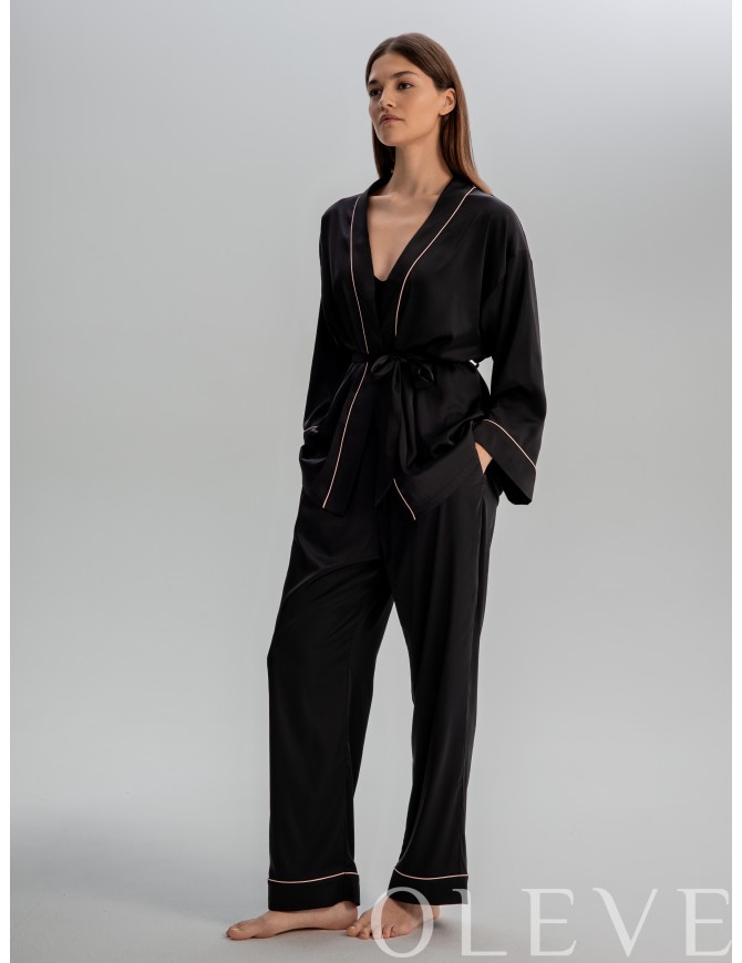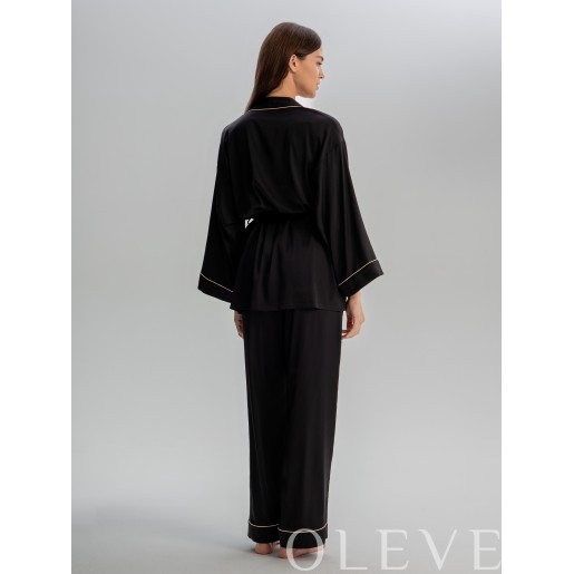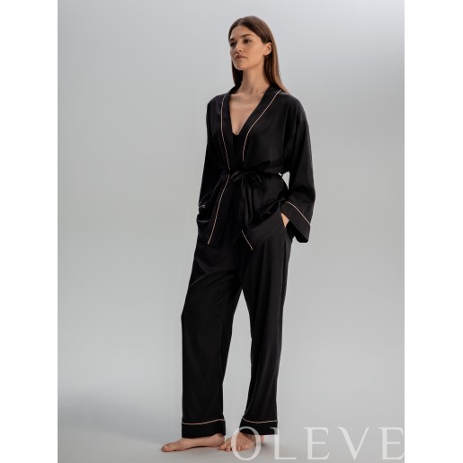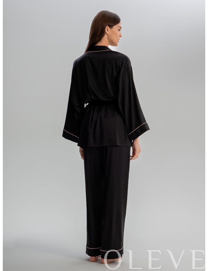 Комплект из брюк и укороченного кимоно. Кимоно на запах, свободного силуэта с поясом, ворот и рукава декорированы контрасным кантом. Прямые брюки комфортной посадки на эластичном поясе с завязками и карманами в боковых швах. Края манжет также подчеркнуты узким контрастным кантом.