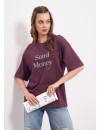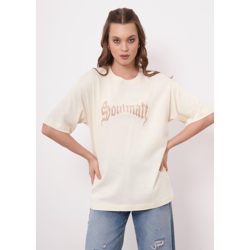 Футболка оверсайз из хлопкового трикотажного полотна. Короткий спущенный рукав. Округлая горловина с обтачкой из рибаны. По спинке средний шов. По переду термостразы.