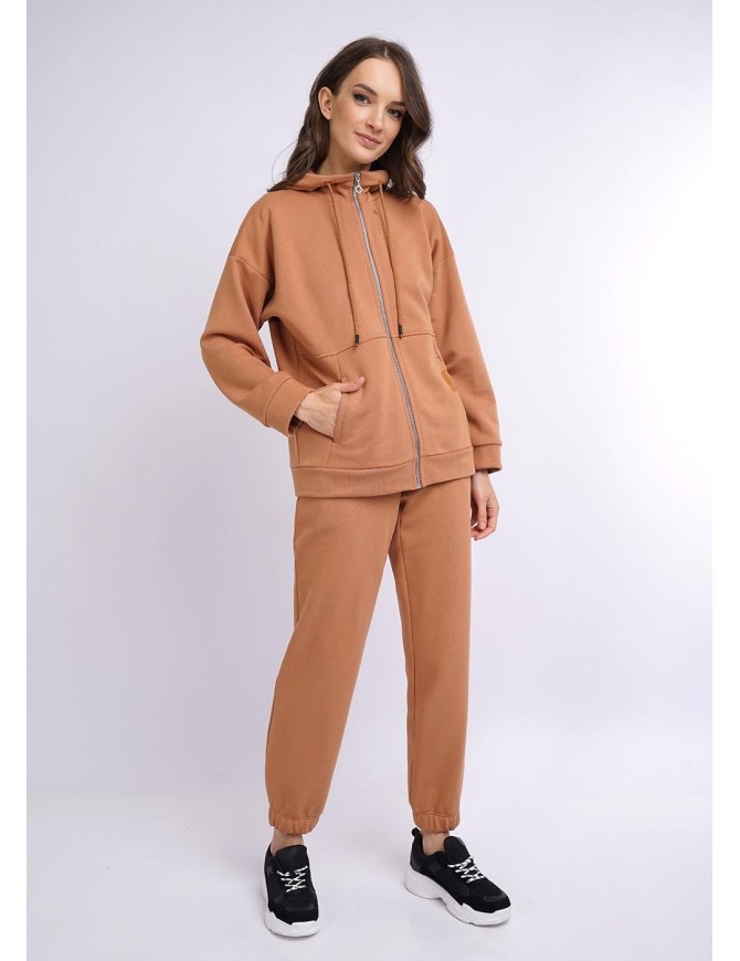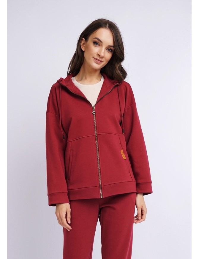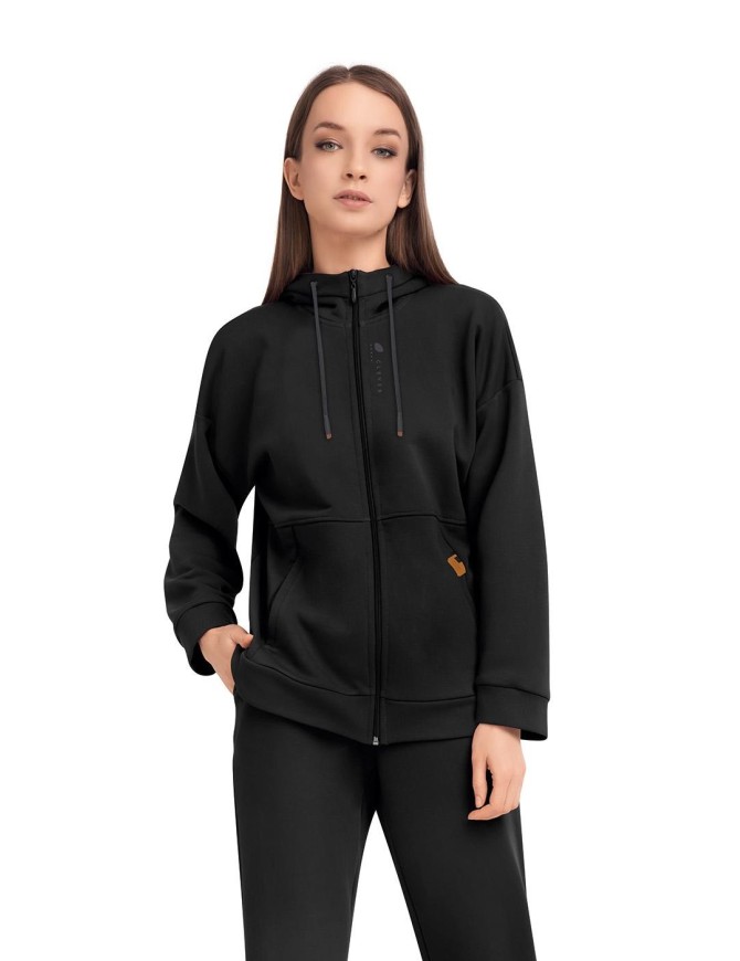 Толстовка на молнии. Спереди горизонтальный рез с острочкой, от реза внутренний карман с кожаным декором с одной стороны. Капюшон со стойкой и отделкой кожаными деталями с люверсами под шнур. По капюшону и вдоль молнии по переду принты в цвет.