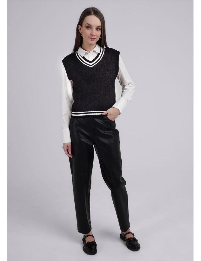 Вязаный жилет умеренного объема из хлопковой пряжи с добавлением акрила. V-образный вырез горловины. По переду косы, по спинке гладь. По низу изделия и бейке горловины контрастные полоски черного цвета.