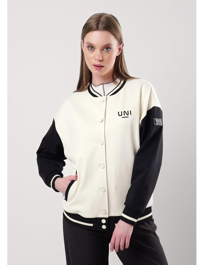 Куртка-бомбер из трикотажного полотна футер, с застежкой на пробивные пуговицы. По горловине вязаная обтачка. Карманы листочка с потайной молнией. Длинный рукав со спущенной линией плеча. По низу рукава, изделия -вязаный манжет,нашивка. Спереди вышивка.
