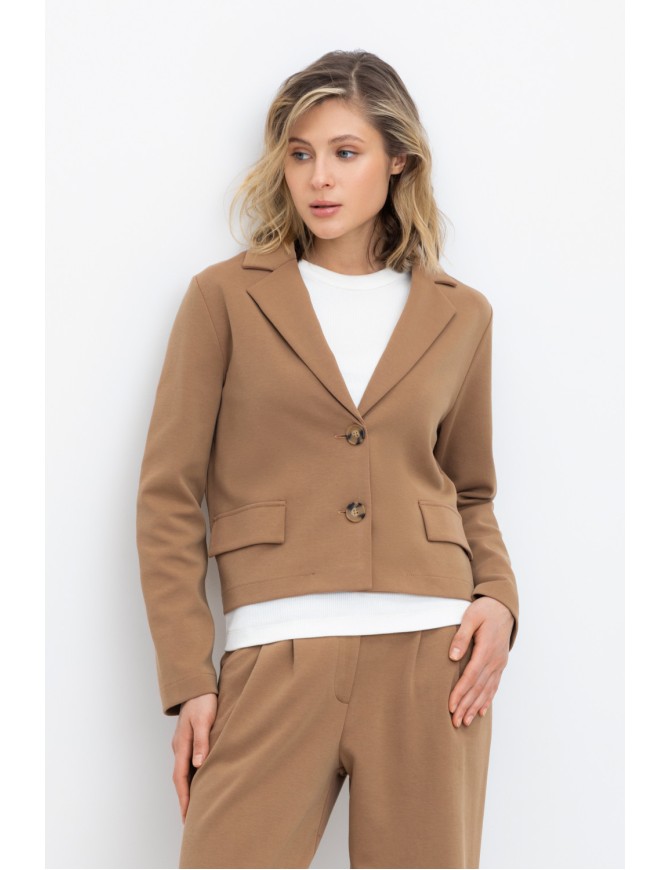 Женский укороченный жакет прямого кроя с имитацией карманов с клапаном из плотного набивного гладкого трикотажа интерлок. Гладкий и плотный материал на основе хлопка сохраняет форму.
