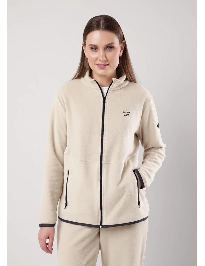 Куртка спортивная прямого силуэта из трикотажного полотна флис, на молнии. По горловине стойка. Спереди горизонтальный рез, карманы на молнии. Длинный рукав со спущенной линией плеча, нашивка.По низу рукава и низа изделия окантовка. Спереди вышивка.
