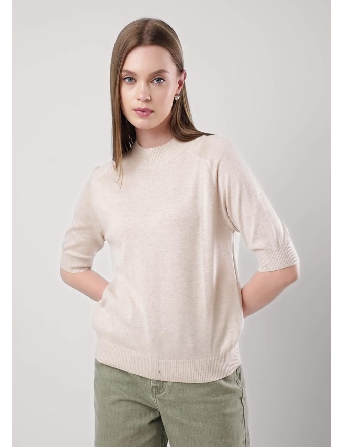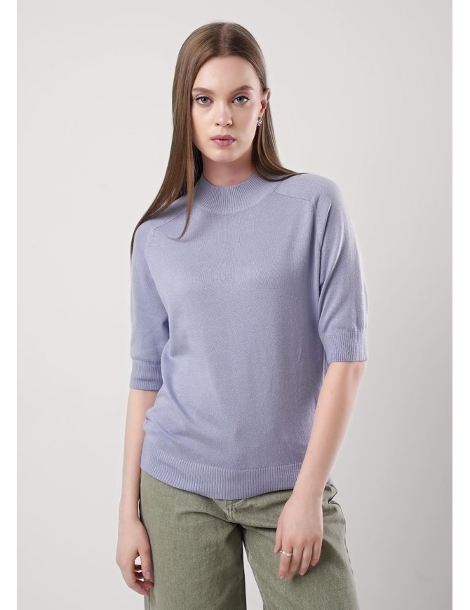Вязаный джемпер прямого силуэта выполнен из комбинации акриловой и хлопковой пряжи гладьевым переплетением. Модель с коротким рукавом реглан и круглым вырезом горловины с полустойкой дополнена манжетами по низу изделия и рукавов. Рекомендуется стирать в режиме "Деликатная стирка" при температуре до 30 градусов, температура утюжки до 110 градусов.