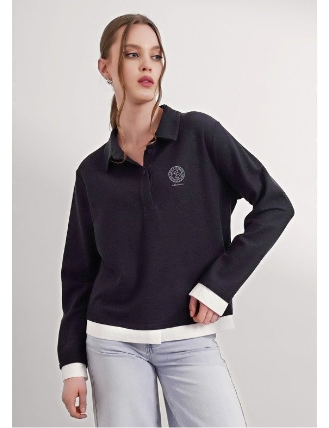 Джемпер поло из трикотажного полотна пике жаккард, прямого силуэта. По горловине отложной воротник со стойкой, спереди планка с пуговицами. По низу рукава и изделия подгибка с контрастной отделочной деталью. Спереди вышивка.