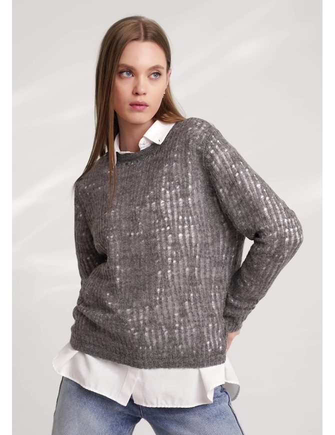 Вязаный джемпер из акриловой пряжи, переплетения ажур на основе глади. Длинный втачной рукав. Округлая горловина с бейкой. По низу изделия, рукавов манжеты.