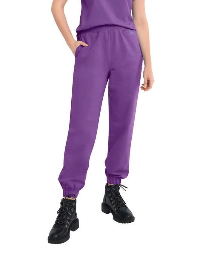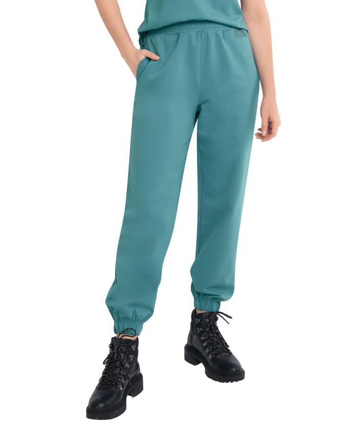 Брюки из футера трендовых цветов, выполнены в спортивном стиле с цельновыкроенными манжетами. Пояс с комфортной резинкой.