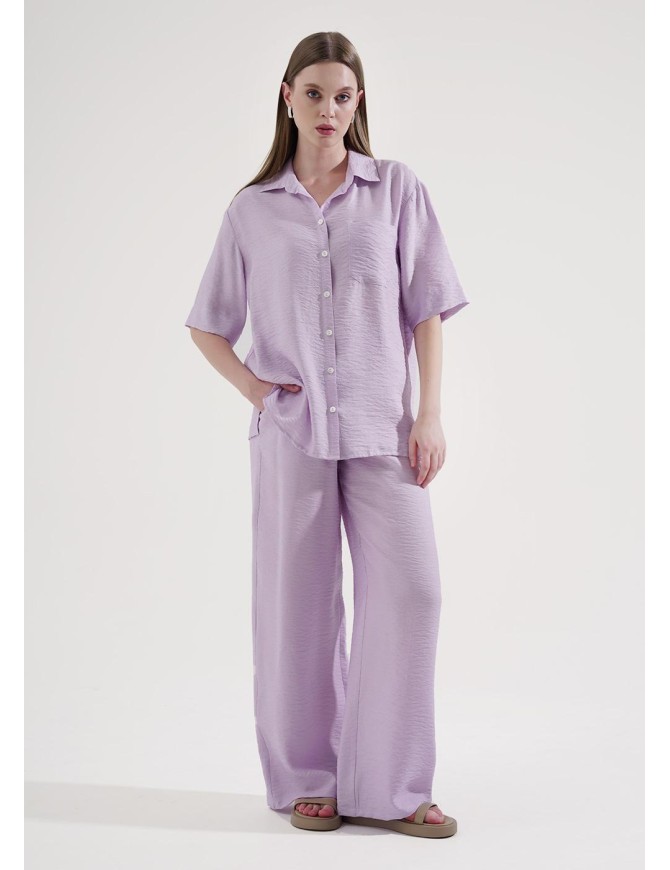 Брюки широкие. По талии пояс на резинке,с завязками. Боковые карманы в отрезном бочке.