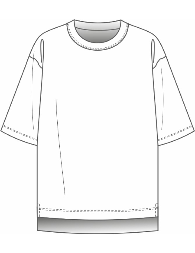Классическая футболка свободного прилегания. Линия плеча спущена. Рукав удлинен. Вырез горловины круглый, обработан бейкой в тон основного полотна.