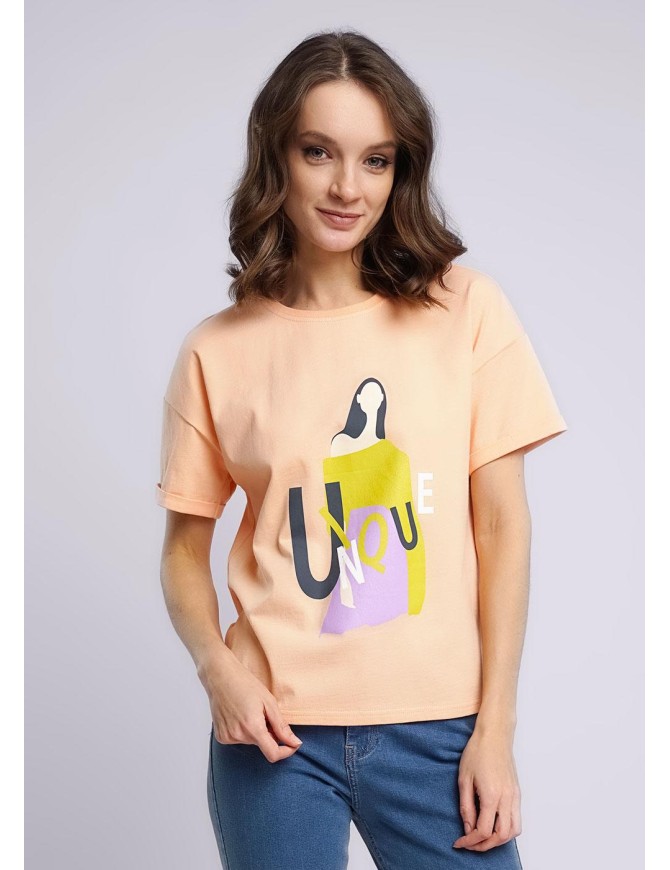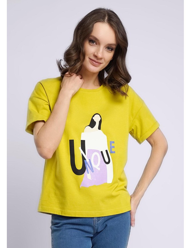 Футболка из хлопкового полотна. Спущенная линия плеча, рукав обработан манжетом с отворотом. Округлая горловина из рибаны. Завершает дизайн принт.
