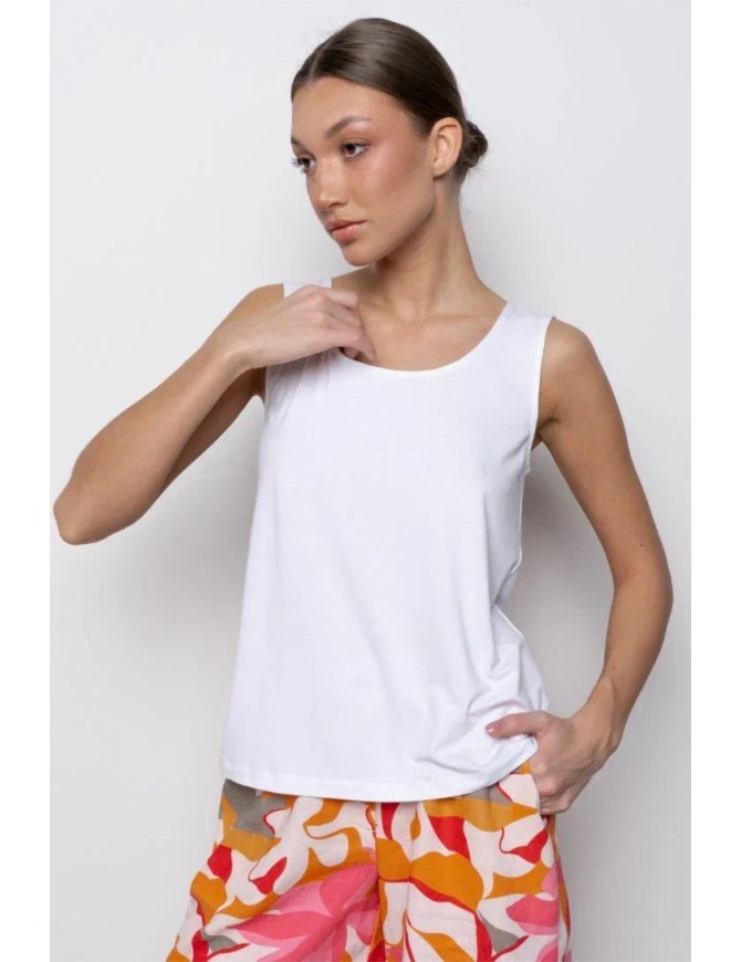 Майка свободного прилегания из вискозы –незаменимая деталь летнего гардероба. Вырез горловины круглый. Модель дополнит образ к любому поясному изделию, пиджаку,кардигану.
