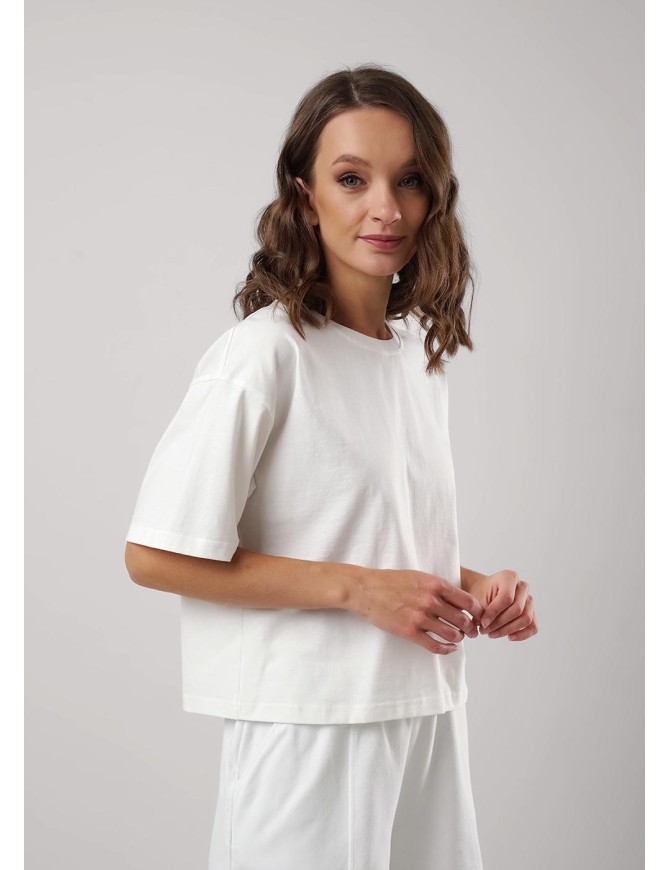 Футболка для дома и отдыха прямого силуэта из хлопкового трикотажного полотна. Округлая горловина с обтачкой. Короткий рукав со спущенной линией плеча. На детали переда принт.