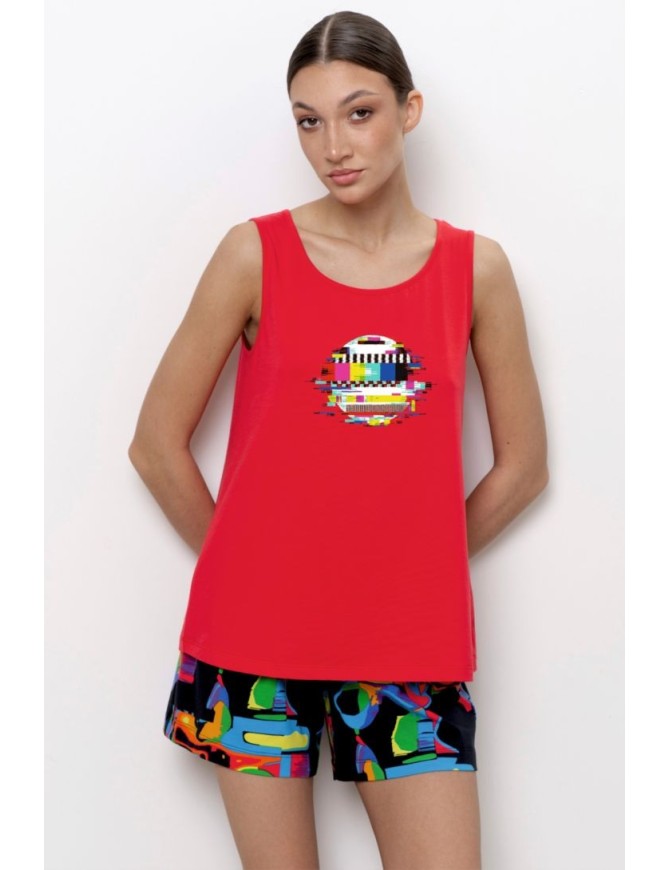 Топ на широких бретелях. Вырез горловины круглый. Топ прекрасно дополнит образ к любым шортам и брюкам данной коллекции, а так же к любому поясному изделию из личного гардероба. Модель представлена в четырех цветовых решениях, декорирована тематическим принтом.