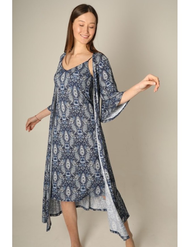 Классический халат- пеньюар выполнен на запах, средней длинны. Практичный и слегка расклешенный рукав.