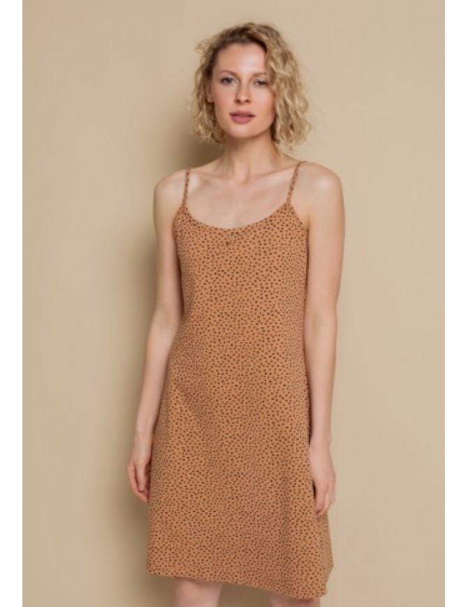 Женская сорочка из трикотажа супрем с эластаном на регулируемых бретелях. Цвет - миндаль с набивными пятнышками. Украшена декоративными пуговицами на груди. Низ изделия обработан плоскими швами.