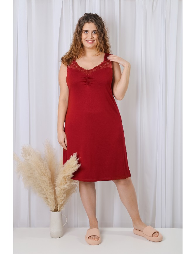 Из трикотажного вискозного гладкокрашеного полотна, слегка расширенная книзу, без рукавов, с кружевной вставкой-кокеткой V-образной формы и небольшой драпировкой в центре груди. Горловина и проймы окантованы основным материалом.
