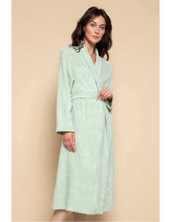 Халат на запахе с длинными рукавами. Сшит из однотонной хлопковой махры в оттенке "ледяной зелёный". В боковых швах два удобных кармана. Пояс продет в шлёвки. Для удобства хранения предусмотрена петелька.