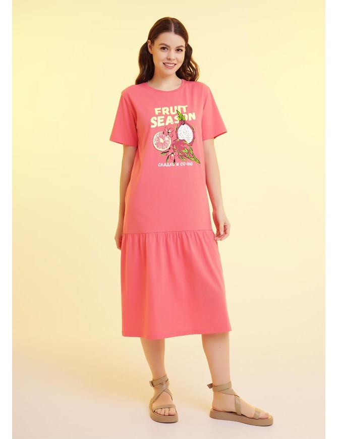 Платье для дома и отдыха из хлопкового трикотажного полотна,прямого силуэта. Втачной короткий рукав, внизу термонаклейка силикон. Округлая горловина с обтачкой. По низу изделия отрезная юбка, собрана на сборку. Спереди принт,вышивка.