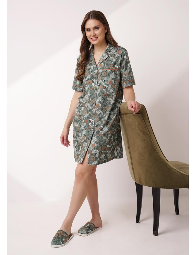 Платье для дома и отдыха прямого силуэта из хлопкового трикотажного полотна. Застёжка на пуговицы, отложной воротник с лацканами. Втачной короткий рукав, внизу с контрастным кантом. Спереди накладной карман с контрастным кантом. Боковые разрезы.