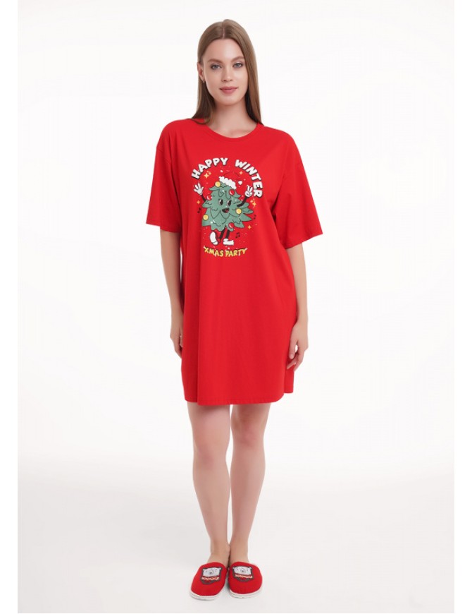Платье для дома и отдыха из хлопкового трикотажного полотна прямого кроя, длиной до колена. Короткий втачной рукав. Округлая горловина с обтачкой. Спереди принт.