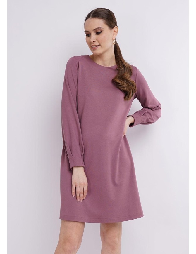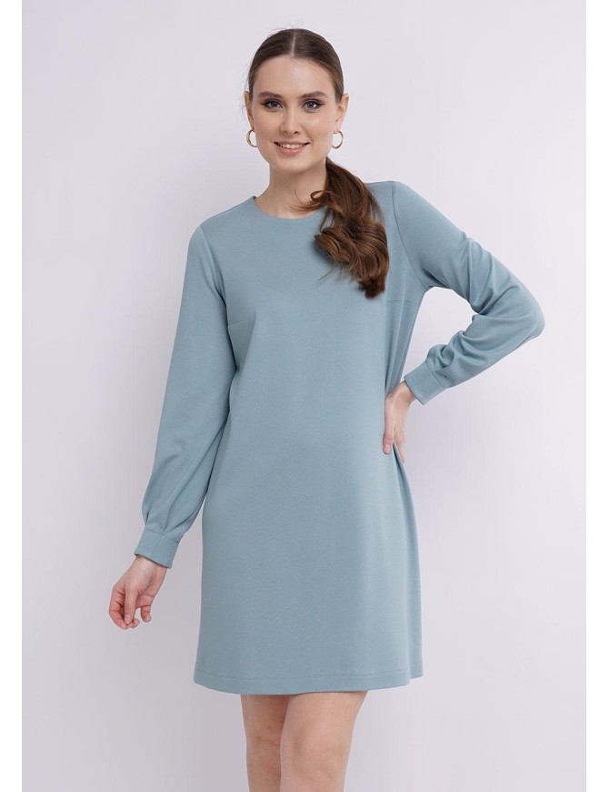 Платье A - силуэта из ткани джерси. Горловина округлая с обтачкой. Втачной длинный рукав, к низу слегка объёмный, по низу рукава защипы. Длина платья чуть ниже колена.