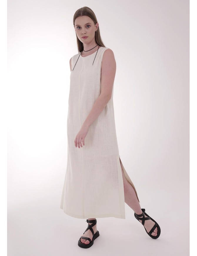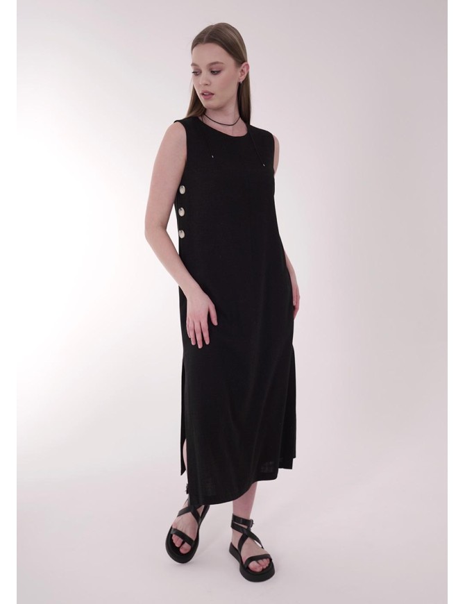 Платье из текстильного полотна лен с вискозой, длиной миди, без рукавов. Платье на подкладе. По переду средний шов,по спинке средний шов с молнией. По боковым швам цельновыкроенная планка с пуговицами. По бокам разрезы.