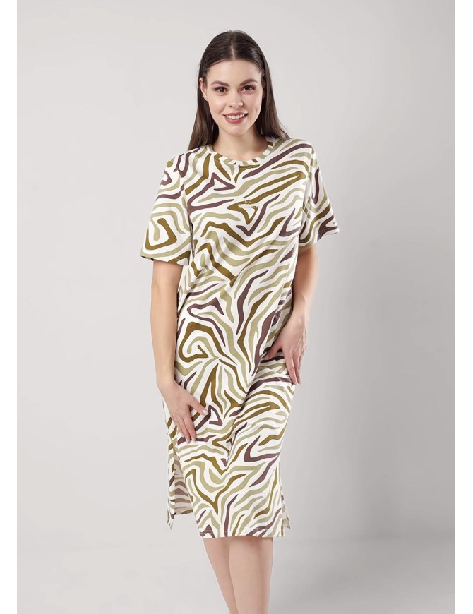 Платье для дома и отдыха из хлопкового трикотажного полотна. Короткий втачной рукав. Округлая горловина с обтачкой. Карманы в боковом шве. По бокам разрезы. Спереди термонашивка.