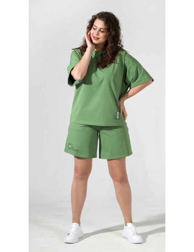 Шорты – удлиненные, на притачном поясе с эластичной тесьмой внутри и карманами в боковых швах. На левой передней половине внизу – декоративный элемент в виде принта. Пояс – с продетым через две обметанные петли шнурком белого цвета.