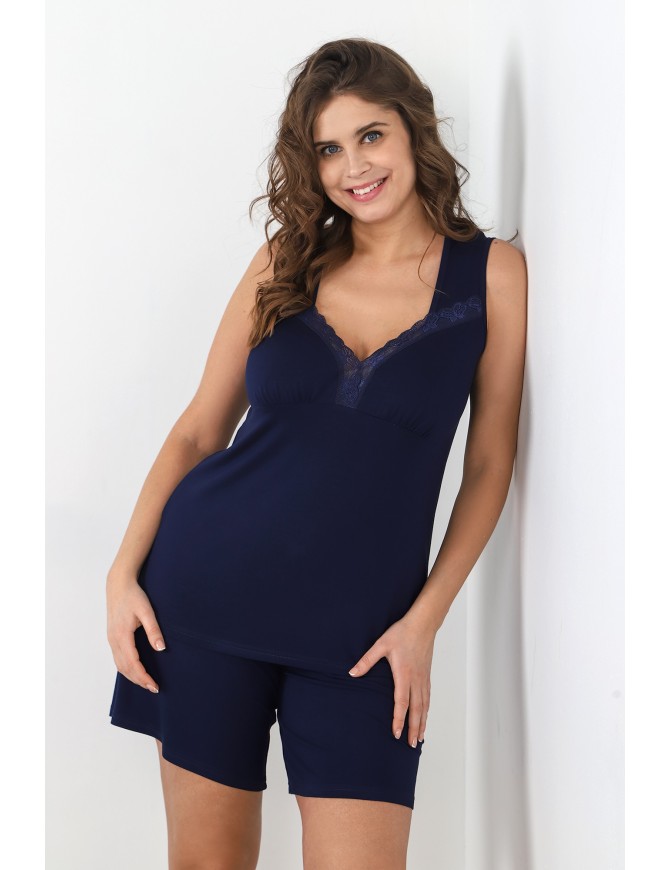 Майка – свободного покроя, слегка расширена книзу, без рукавов. Перед – с лифом «бюстье» и двумя небольшими притачными кокетками. Верхние срезы лифа, образующие v-образный вырез спереди, отделаны кружевом в цвет основного материала. Чашечки лифа присборены по шву притачивания к основной детали переда. Горловина и проймы окантованы основным материалом.