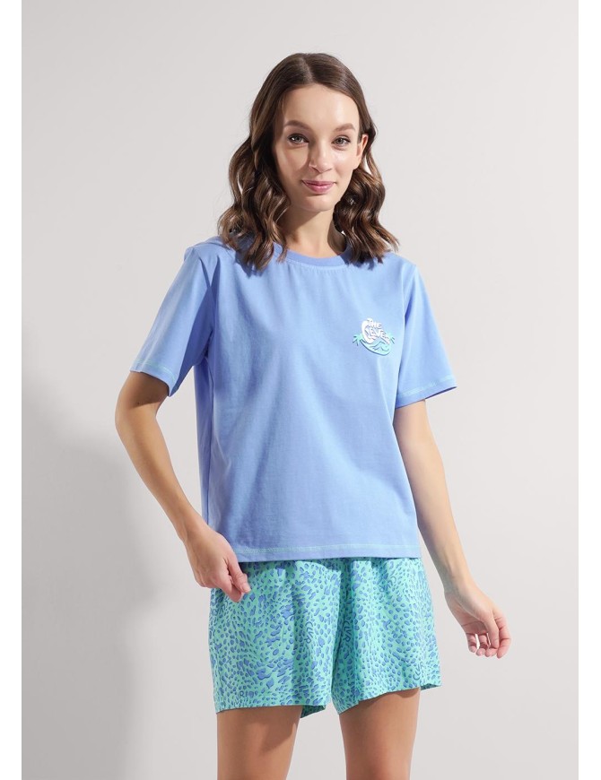 Набор одежды для дома и отдыха из трикотажного полотна.Футболка прямого кроя, горловина с обтачкой.Короткий втачной рукав. Спереди принт,нашивка. По низу рукава и изделия застилы.Шорты на резинке и шнуром из окантовки. Боковые карманы с отрезным бочком.