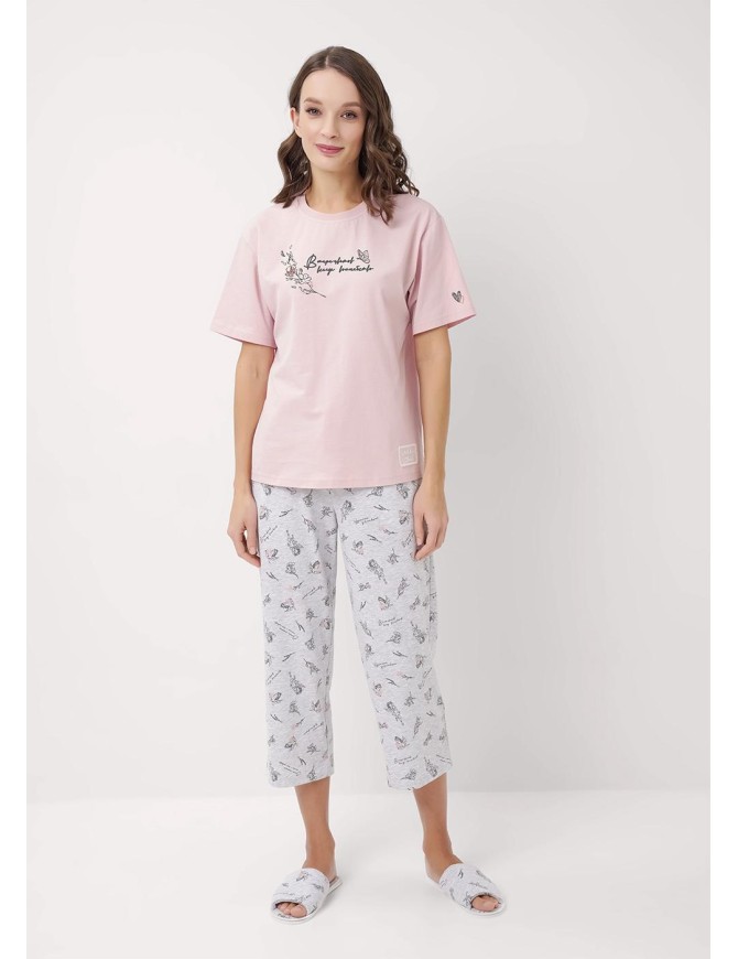 Набор одежды из трикотажного полотна.Футболка прямого кроя,горловина с обтачкой.Короткий втачной рукав.Спереди и по рукаву принт, внизу ажурная нашивка.Бриджи с притачным поясом на внутренней резинке и киперной лентой.Боковые карманы с отрезным бочком.
