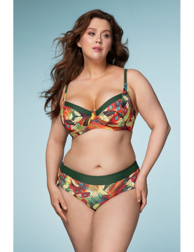 Раздельный купальник на каркасах с мягкой чашкой без уплотнения выполнен из комбинации принтованной и однотонной ткани .Бретели с регуляторами и металлическая застежка позволяет идеально подогнать посадку лифа на любую грудь.Боковая косточка не позволяет