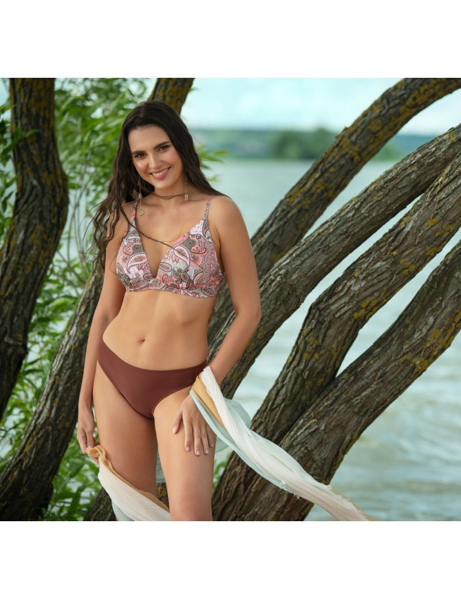 Раздельный купальник с формованной чашкой новейшей разработки красиво формирует грудь любой формы. Бретели с регуляторами и металлическая застежка позволяют идеально подогнать лиф по фигуре.Купальник выполнен из принтованной и однотонной ткани ,устойчивой к хлору. Трусы танга полностью дублированы подкладочной тканью.
