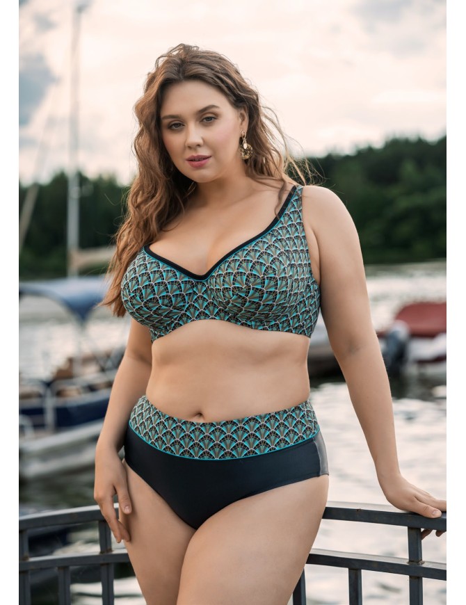 Раздельный купальник на каркасах с мягкой чашкой без уплотнения.Купальник выполнен из комбинации однотонной и принтованной ткани .Лиф полностью дублирован подкладочной тканью . Бретели с регуляторами и широкая металлическая застежка позволяет идеально подогнать посадку лифа на любую грудь. Боковая косточка не позволяет