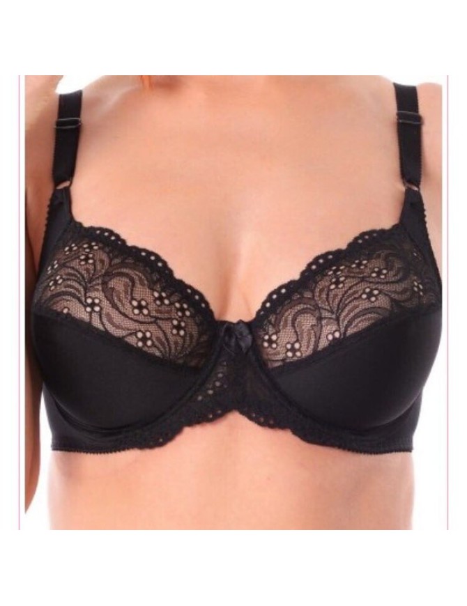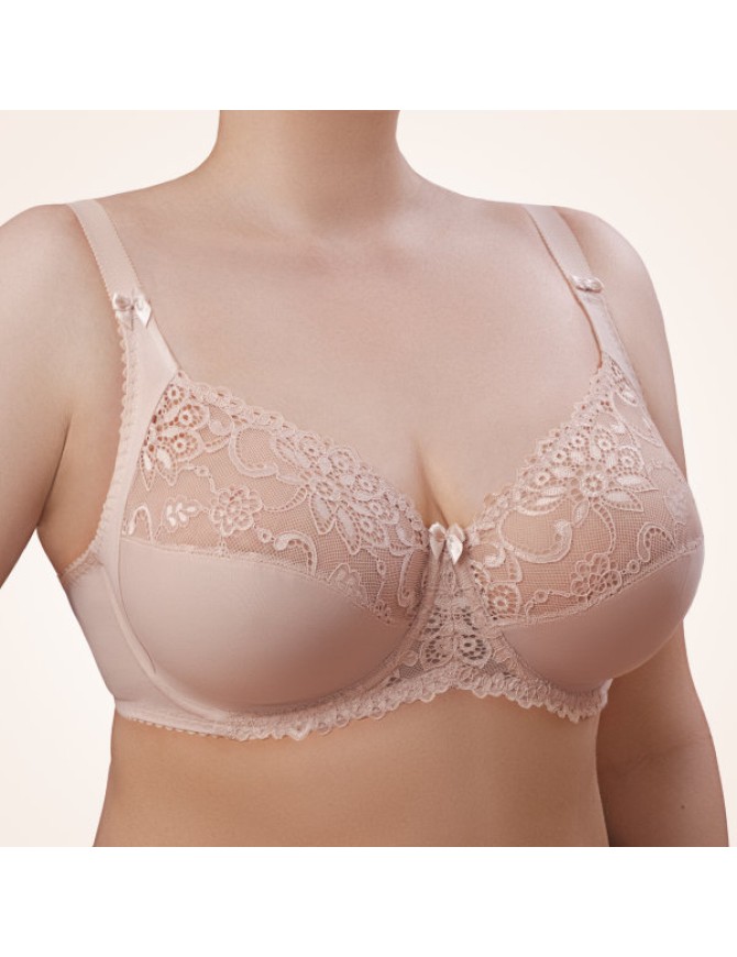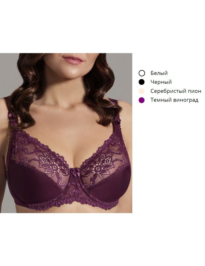 Бюстгальтер из неэластичного и эластичного трикотажного полотна и эластичного кружева. На каркасах. Мягкие чашки с двойным членением и боковой корректирующей деталью. Отделка – бантик.