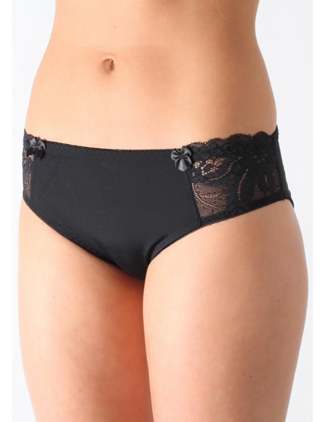 Классическая модель из однотонного трикотажа. На детали переда - симметричные кружевные вставки. По ножке и талии - резинка с фестоном. На детали переда - небольшой атласный бант