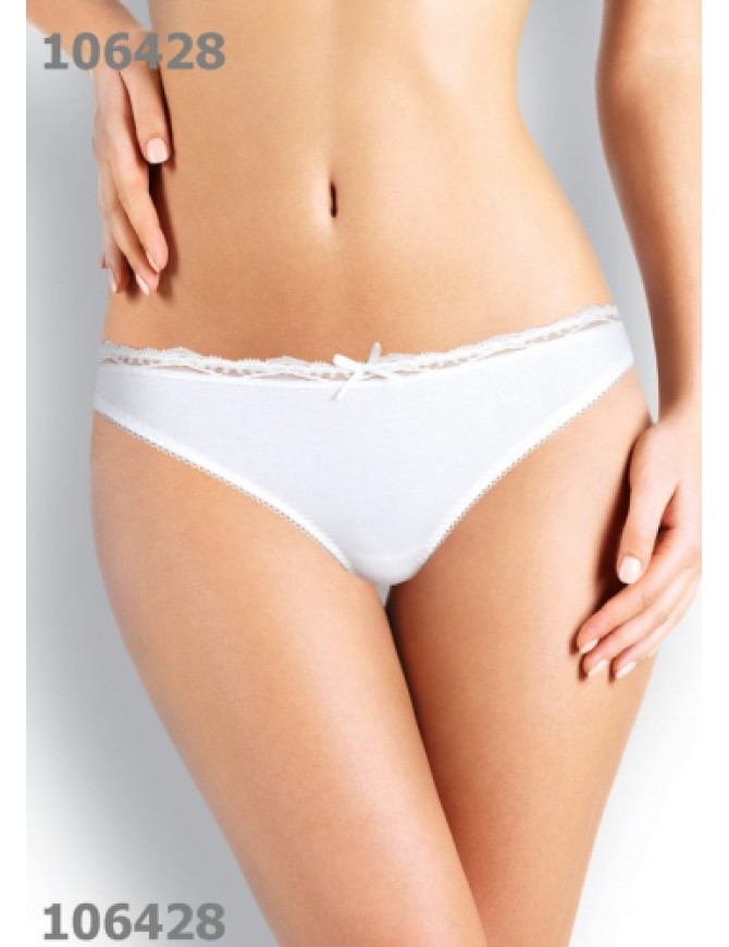 Трусы стринги комфортной посадки из однотонного трикотажа. По ножке обработка резинкой с фестоном, по талии обработка кружевом. Спереди небольшой бант